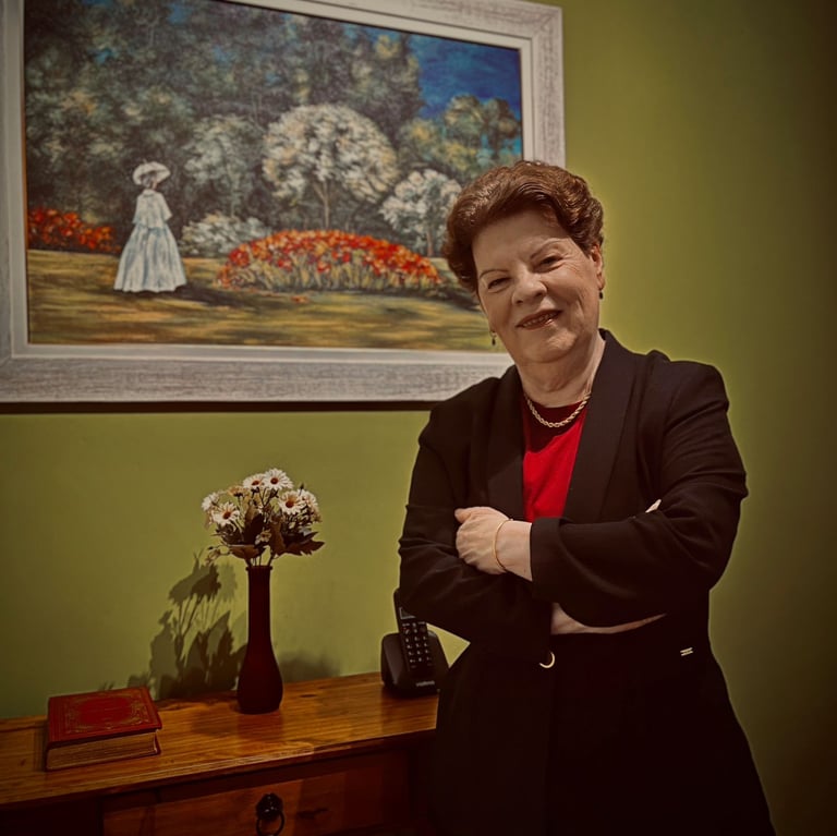 “Inicialmente professora, até que um dia, já com dois filhos e uma filha, soube que a UniRitter abriria muito perto de sua casa. Então, com incentivo da família e amigos, iniciou o curso de Direito. Não obstante, um ano antes de finalizar o curso, iniciou estágio em um escritório de advocacia, no qual continuou até um ano após formada. Após este período, abriu seu próprio escritório em 1988, na Rua Cândido Machado, no edifício Marcílio Schiavon, permanecendo até 98, quando transferiu o escritório para a Gonçalves Dias. Durante os anos atuou junto aos filhos, Lisandro e Márcio, e agora com o neto Andreas, que estagiou no escritório da família e se viu compelido a participar da tradição familiar — profissão em que muito edificou sua família.